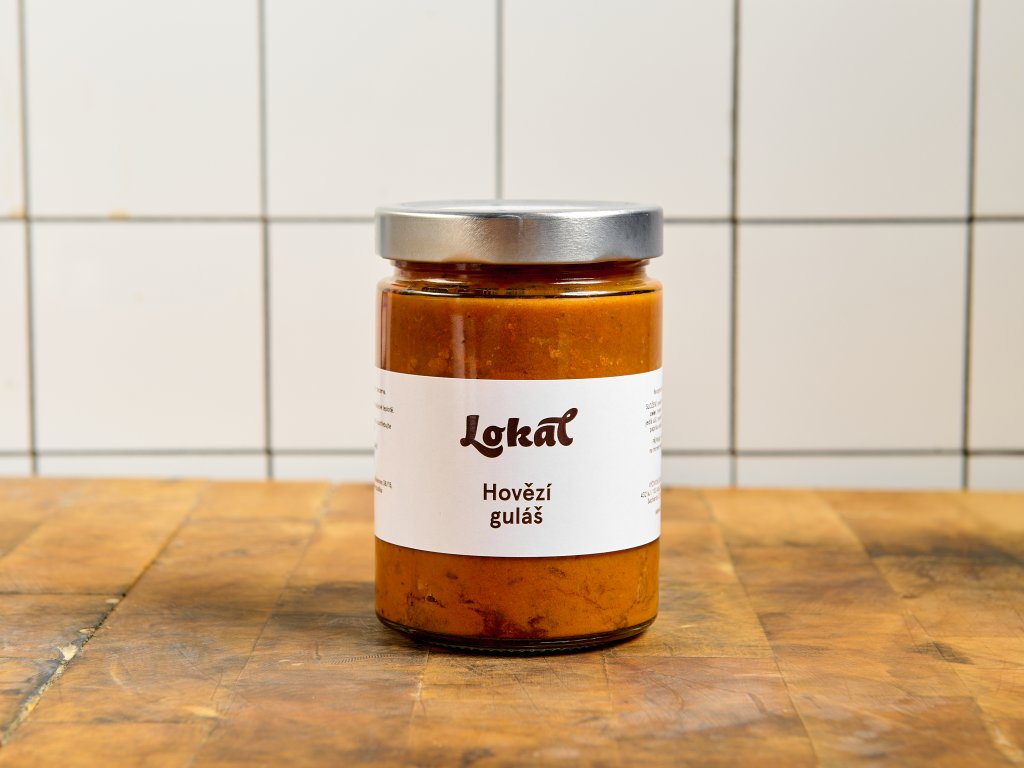 Složení: hovězí maso 30 %, cibule, hovězí vývar ( hovězí kosti, celer, mrkev, petržel, koření ), rajčatový protlak ( rajčata, jedlá sůl ), hovězí lůj, vepřové sádlo škvařené, Pšeničná mouka, paprika sladká, česnek, chilli, sůl, pepř, kmín, majoránka.