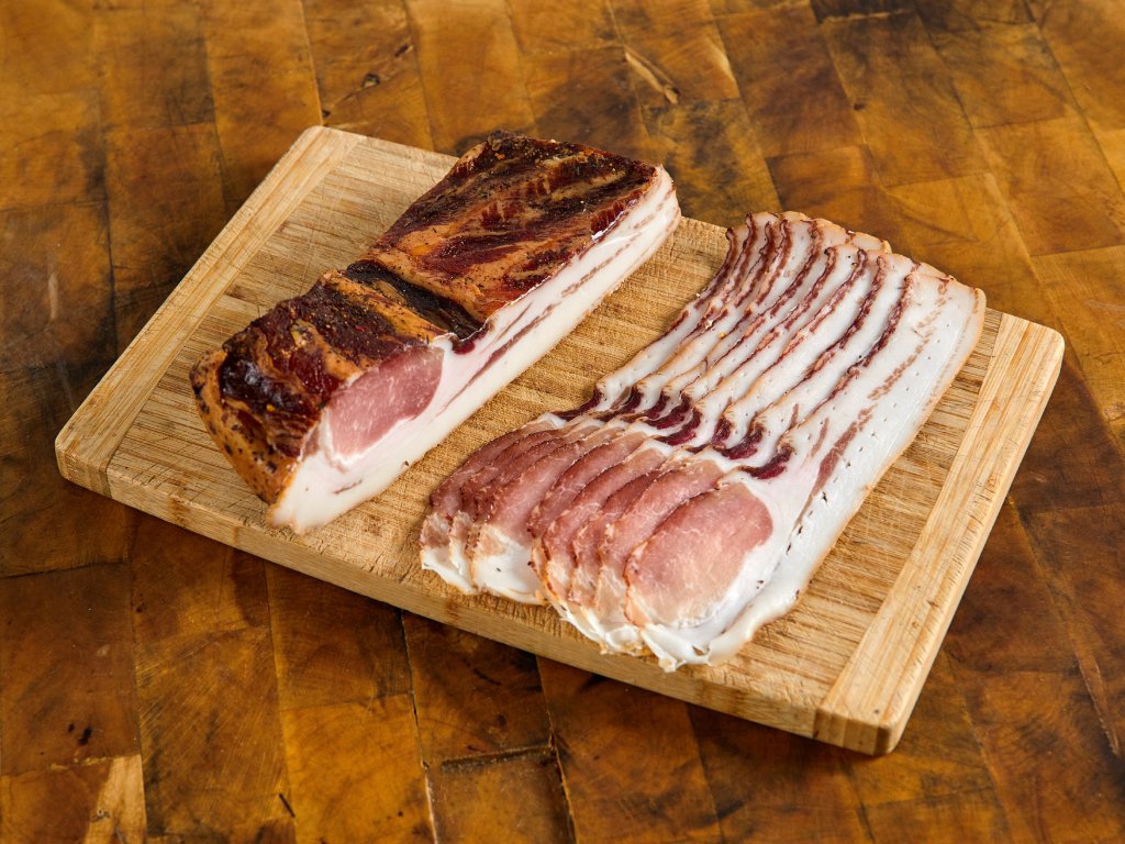 Složení: vepřová pečeně bez kosti, třtinový cukr, dusitanová nakládací sůl, černý pepř, jalovec, chilli, česnek, tymián.